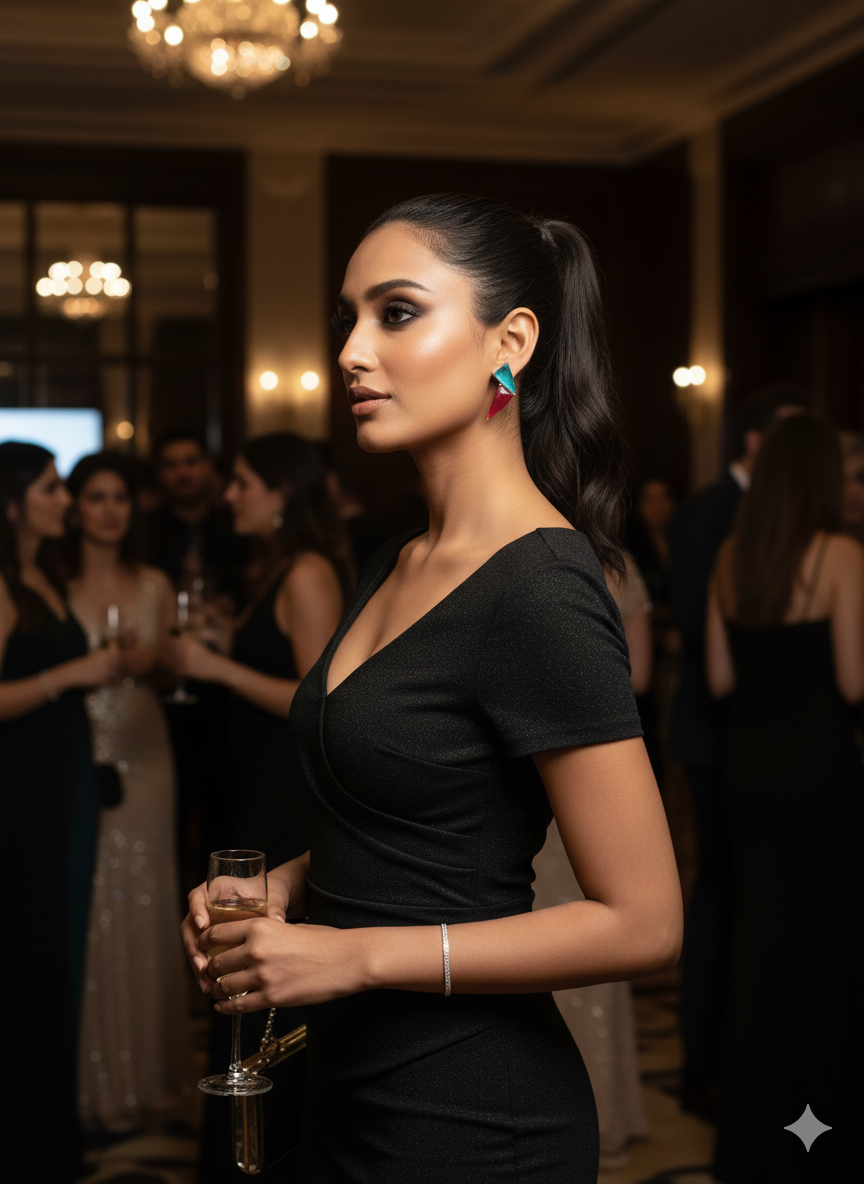 An avant-garde blend of ruby and aqua gemstones — these angular earrings capture cosmic contrast and sculptural elegance in motion.