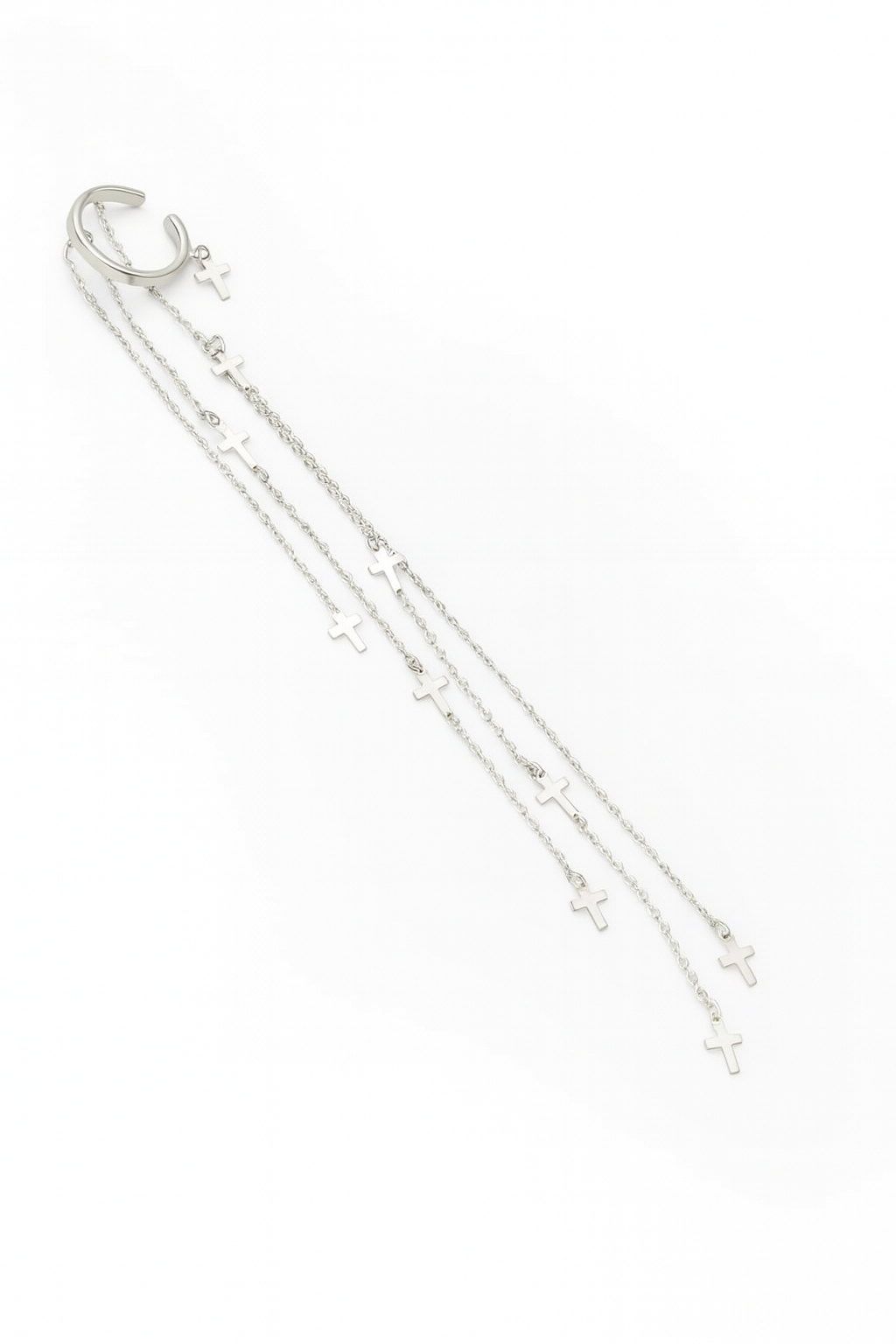 Elegant silver-plated ear cuff blending celestial symbolism and modern minimalism in a sculptural statement.