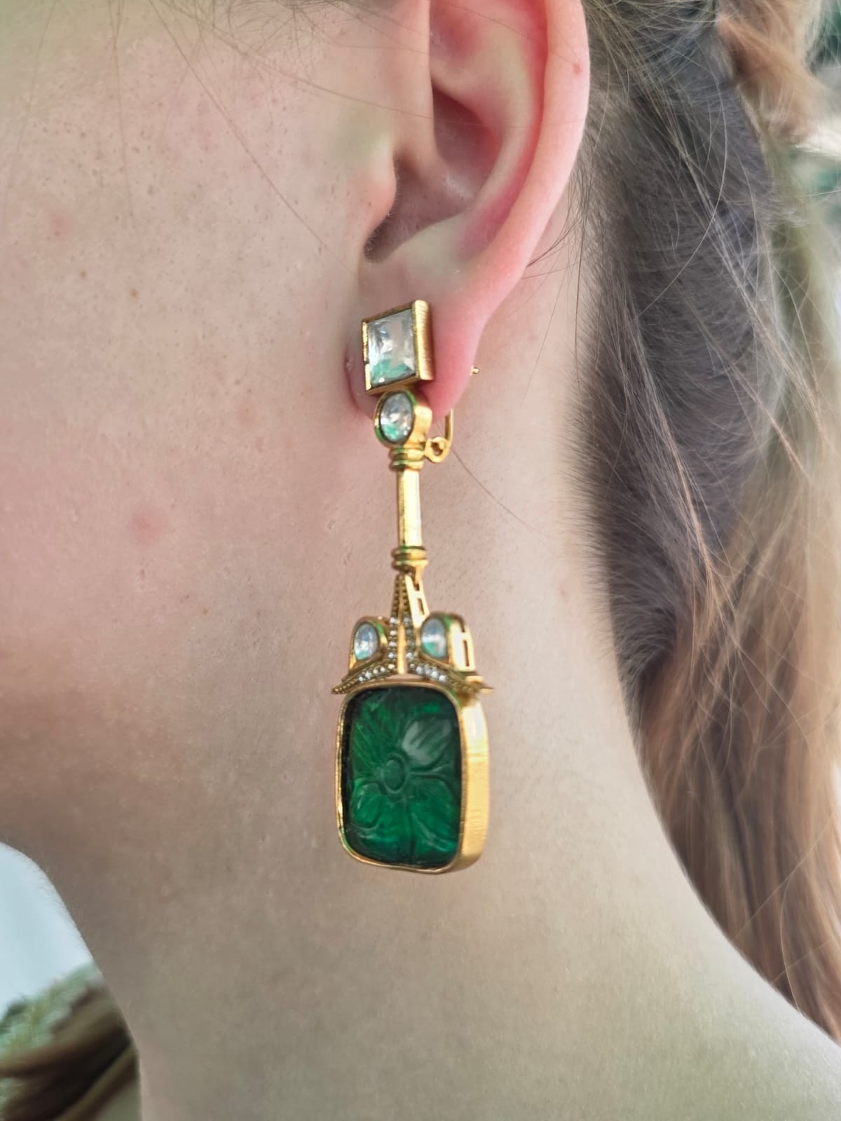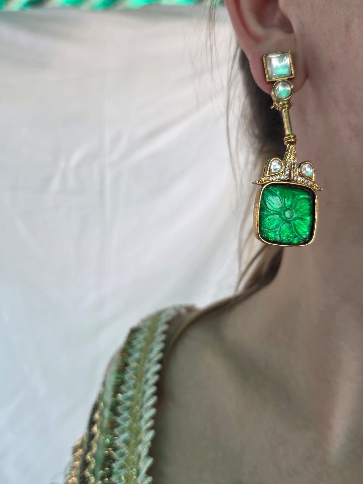 Maharani Patina heritage earrings feature carved green stone, gold-plated detailing, and sparkling crystals. Regal, timeless, and handcrafted, these statement earrings celebrate royal elegance and artisanal craftsmanship for modern women
