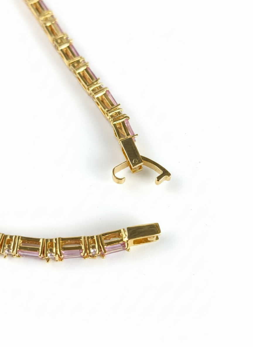 Illuminate your neckline with the Solar Veil Choker — a 24K gold-plated baguette choker glowing with blush-pink stones and celestial elegance.