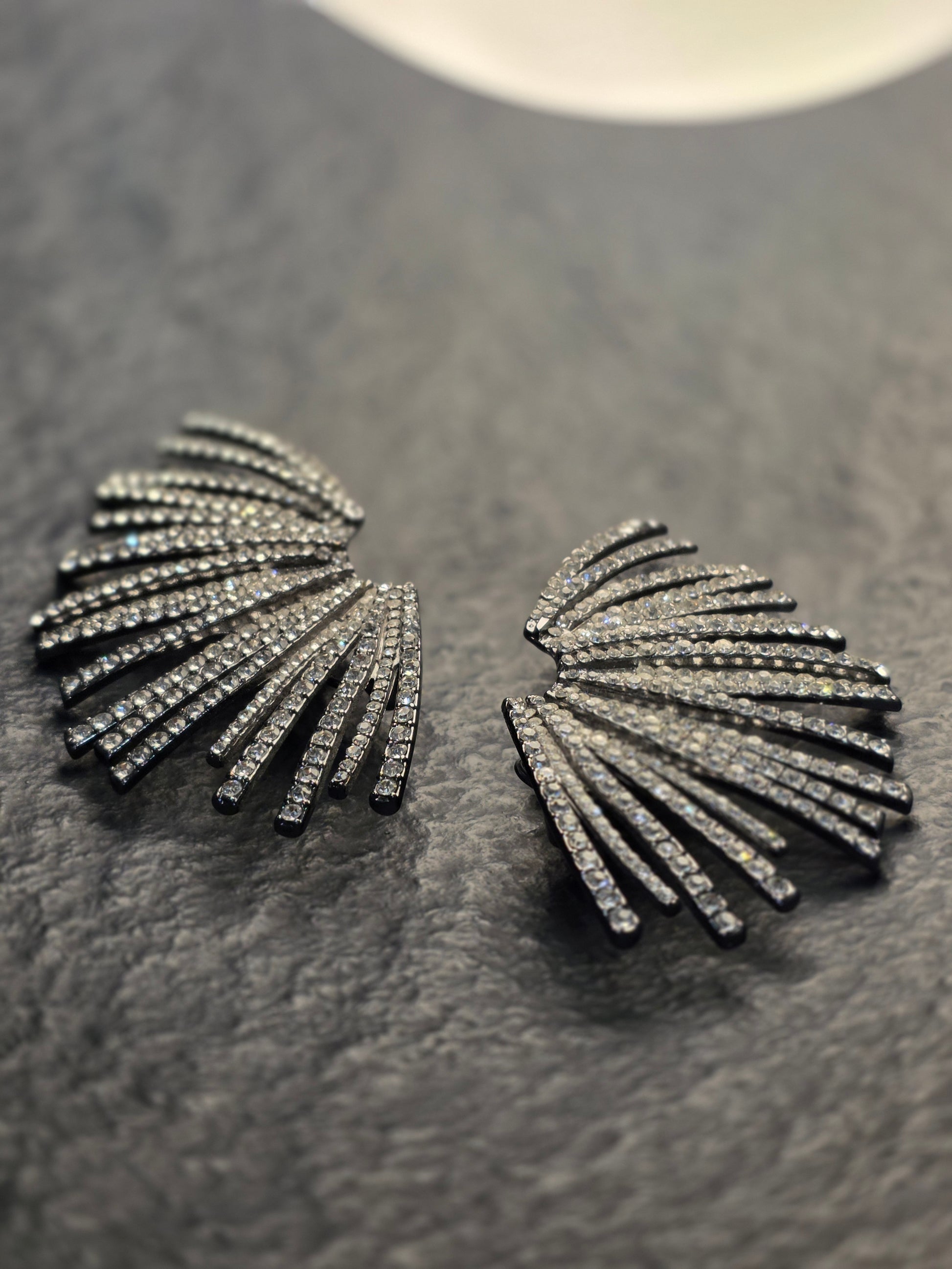 Command the spotlight with the Starburst Earrings, a high-fashion statement inspired by the explosive energy of a supernova. These striking fan-shaped earrings are meticulously crafted from premium brass with a sleek silver-tone finish. One side features a smooth, polished metallic surface, while the other is fully encrusted with rows of brilliant, light-reflecting crystals, creating a bold architectural look that frames the face with unparalleled radiance.