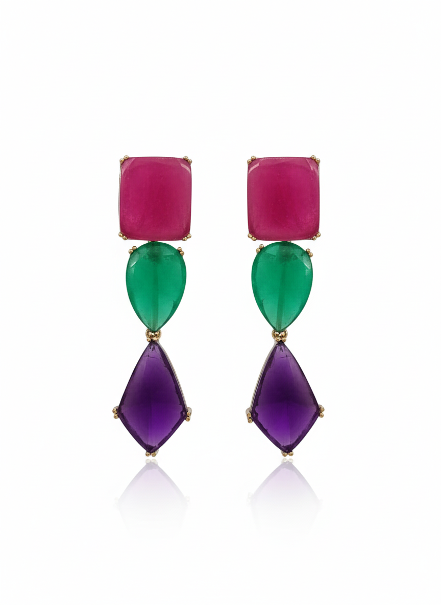 18K gold-plated brass with hand-cut resin gemstones in ruby red, emerald green, and royal amethyst purple. Glossy handcrafted finish.
