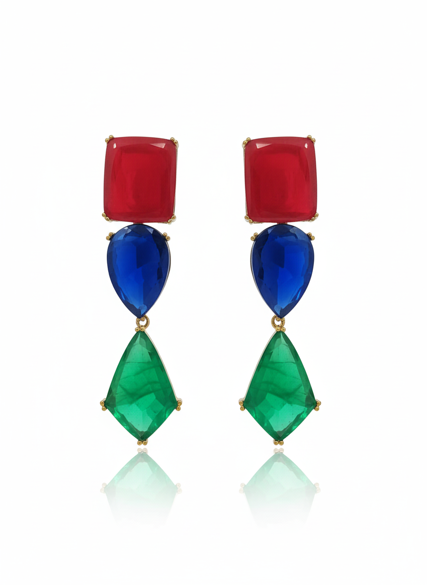 18K gold-plated brass with hand-cut resin gemstones in ruby red, emerald green, and royal amethyst purple. Glossy handcrafted finish.